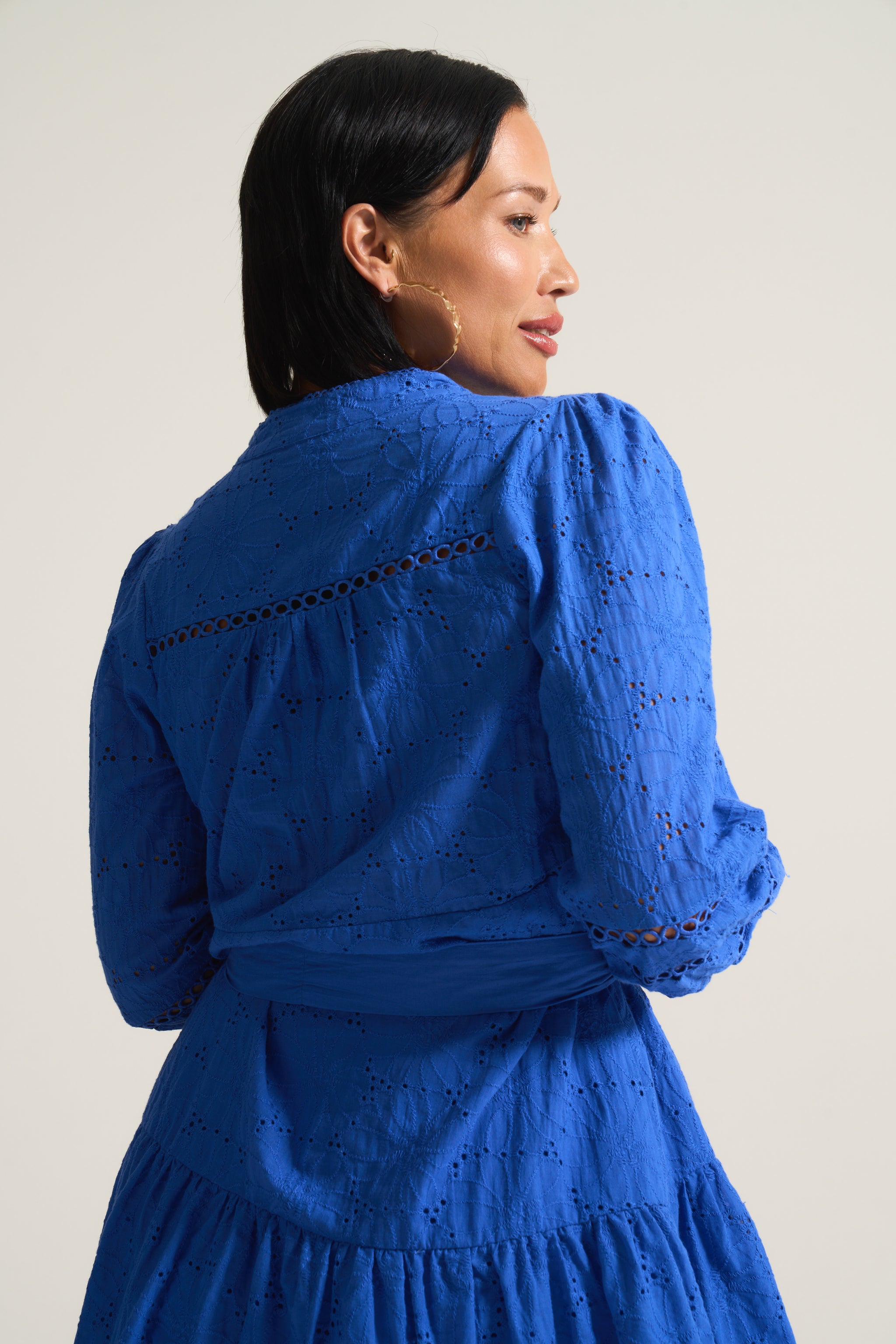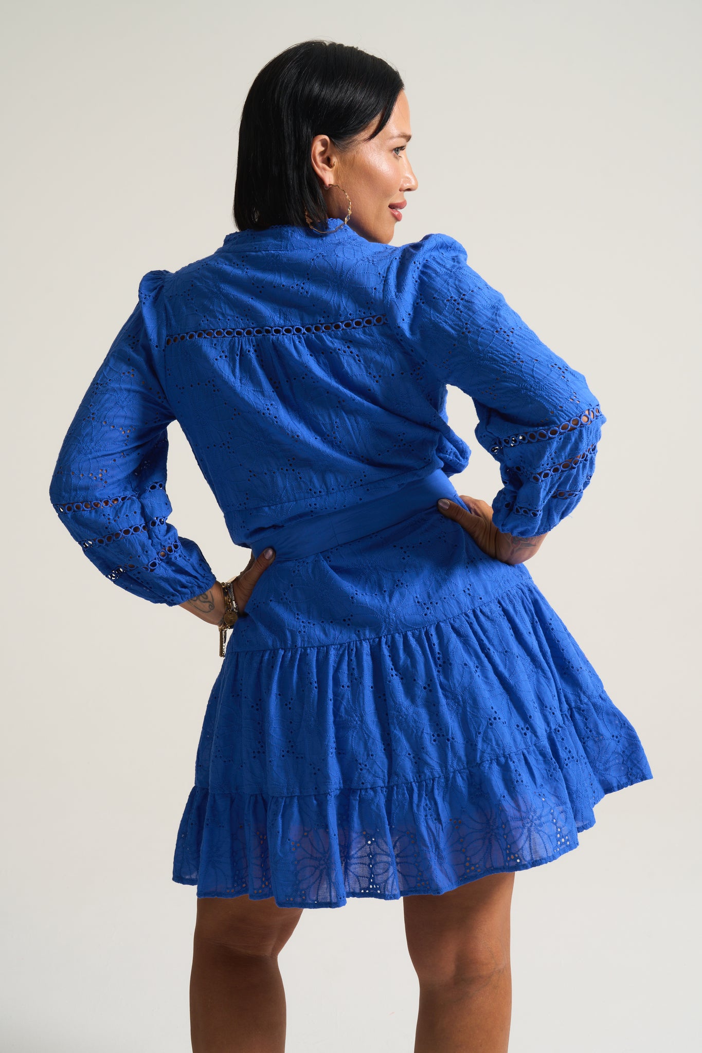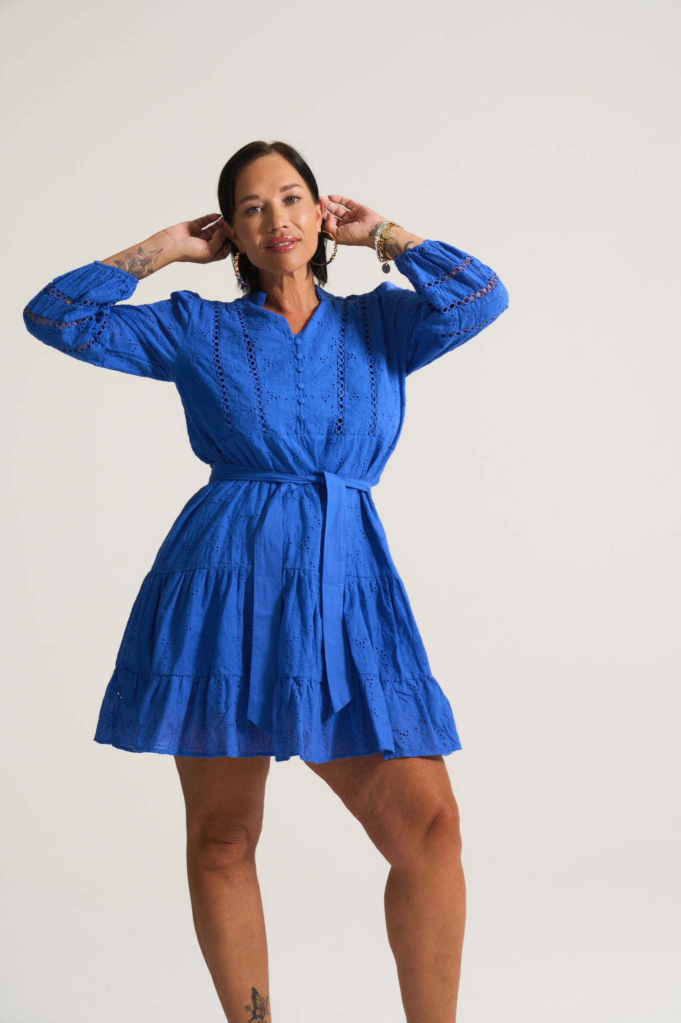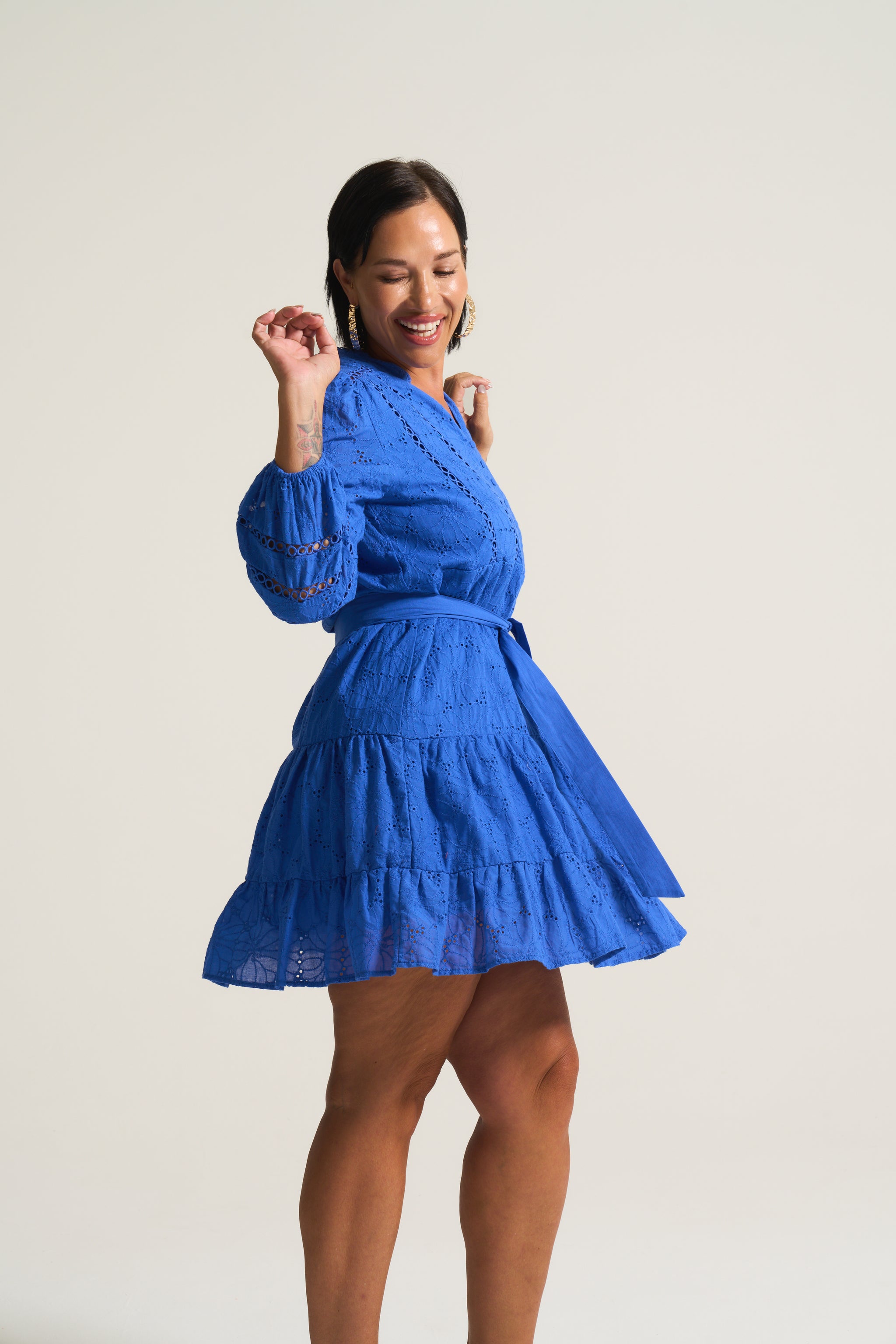 Fresh and feminine with a confident edge, the Cobalt Tier Flirt Dress is crafted from 100% cotton anglaise for a breathable, lightweight feel. Designed with soft tiered detailing and finished with a self-fabric belt to define the waist, this mini dress balances playful movement with everyday polish. An easy statement piece that feels effortless yet considered.
