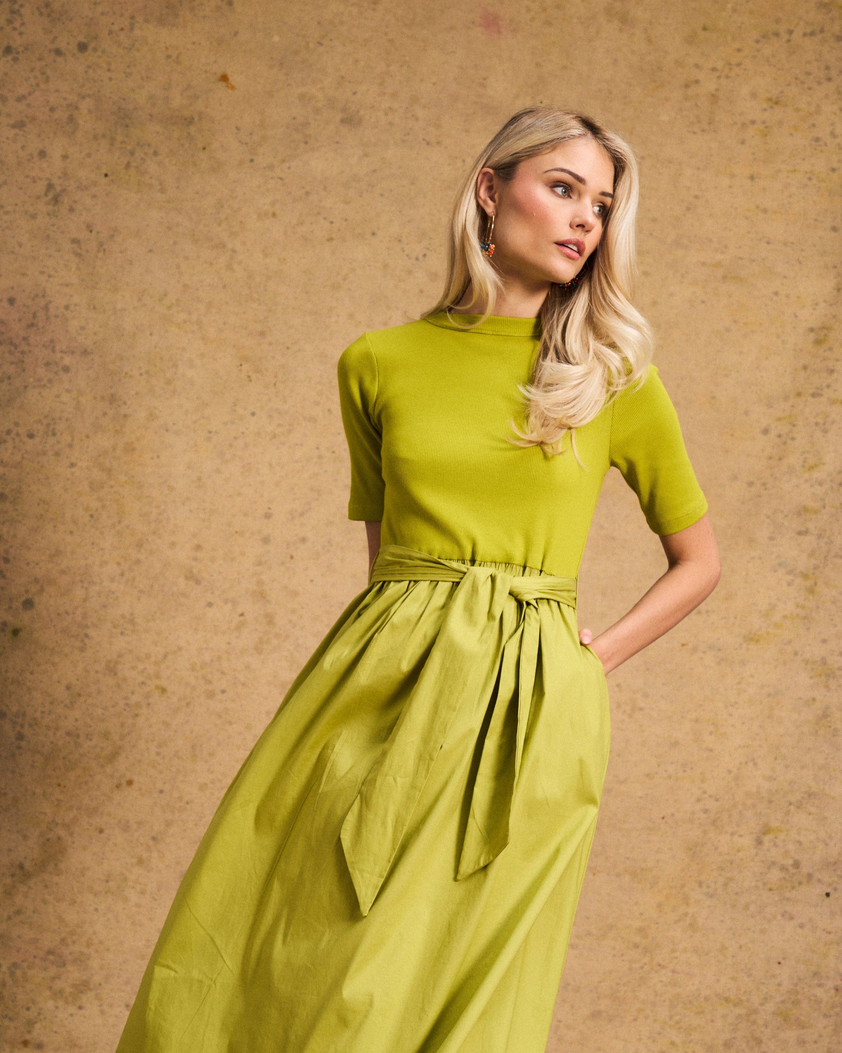 This elegant Venice dress features a form-fitting ribbed cotton top paired with a 100% cotton flare skirt complete with pockets. A best-seller, it’s an ideal choice for summer sophistication.