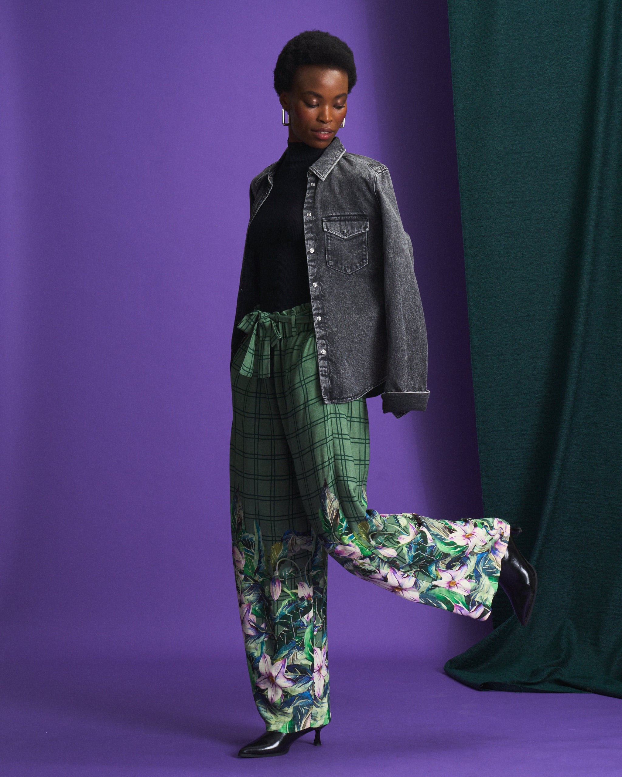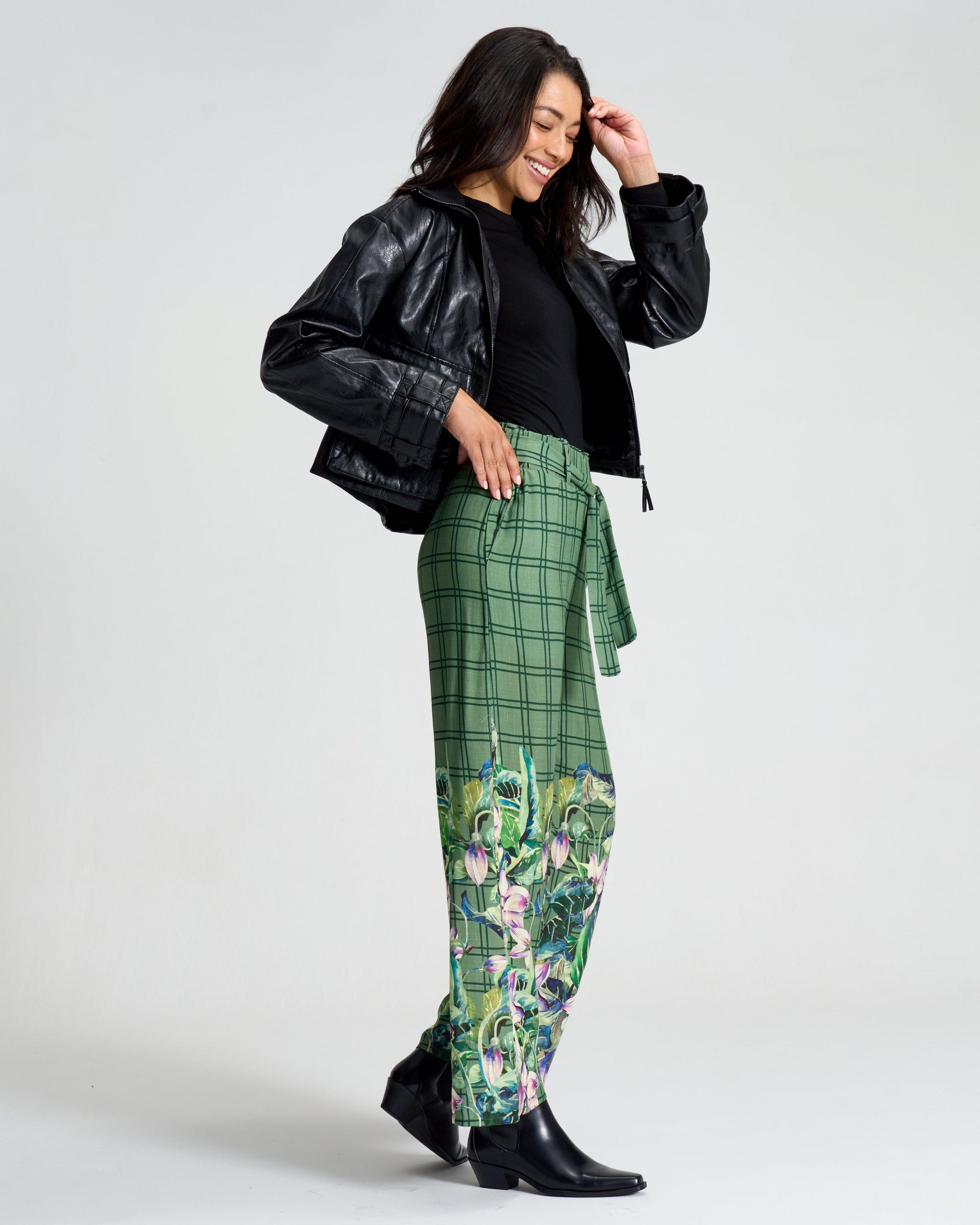 The signature meadow check print with delicate botanical florals allows these pants to pair beautifully with the Meadow Check Liza Shirt Dress or layer effortlessly with Kokonova knitwear and coats for a coordinated seasonal look.