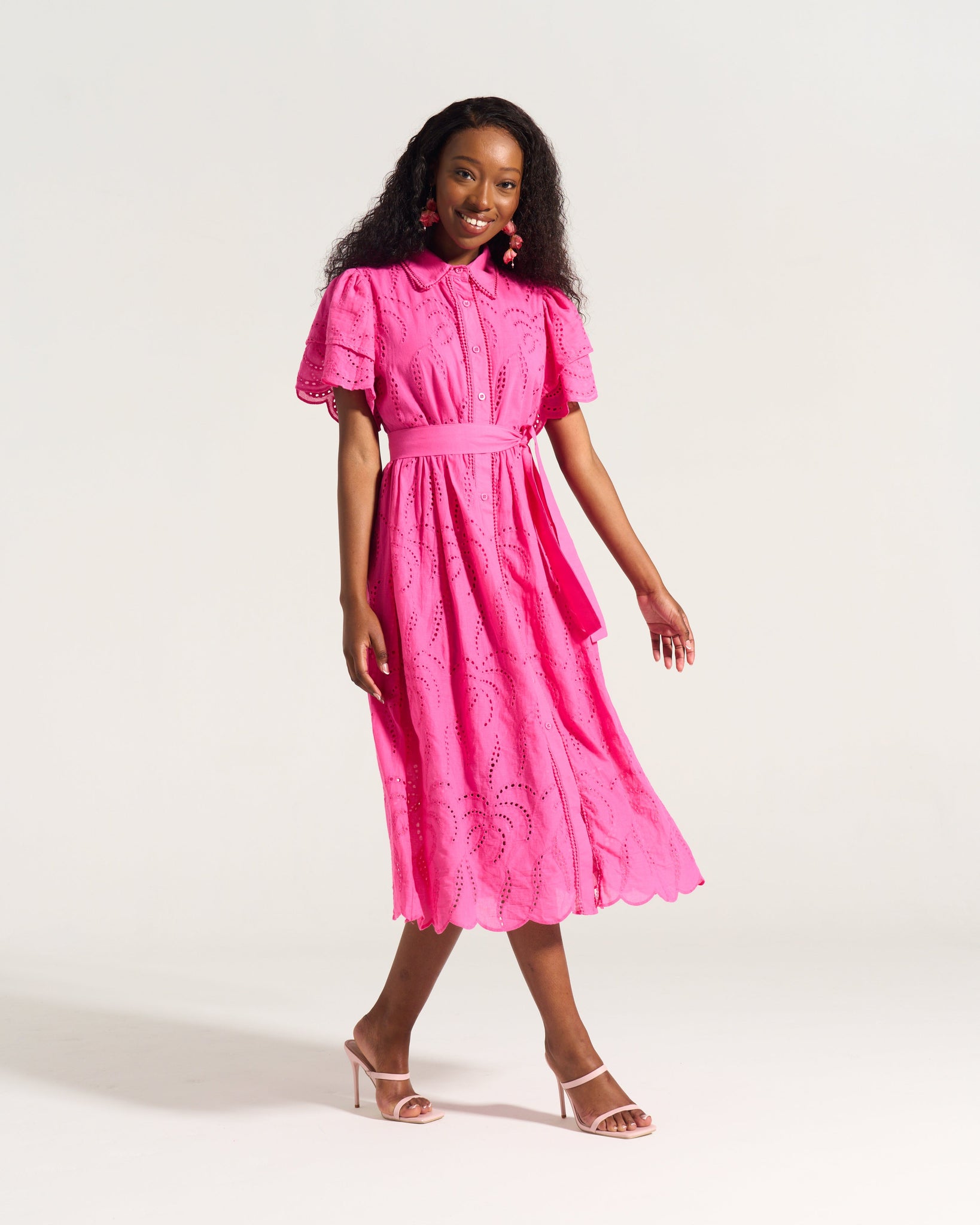 Discover the perfect fusion of feminine charm and everyday functionality with our Cotton Anglaise Dress. This exquisite piece showcases delicate anglaise detailing while delivering the practical elements modern women crave - functional pockets, elegant button closure, and a waist-defining belt. We are super obsessed with this dress!