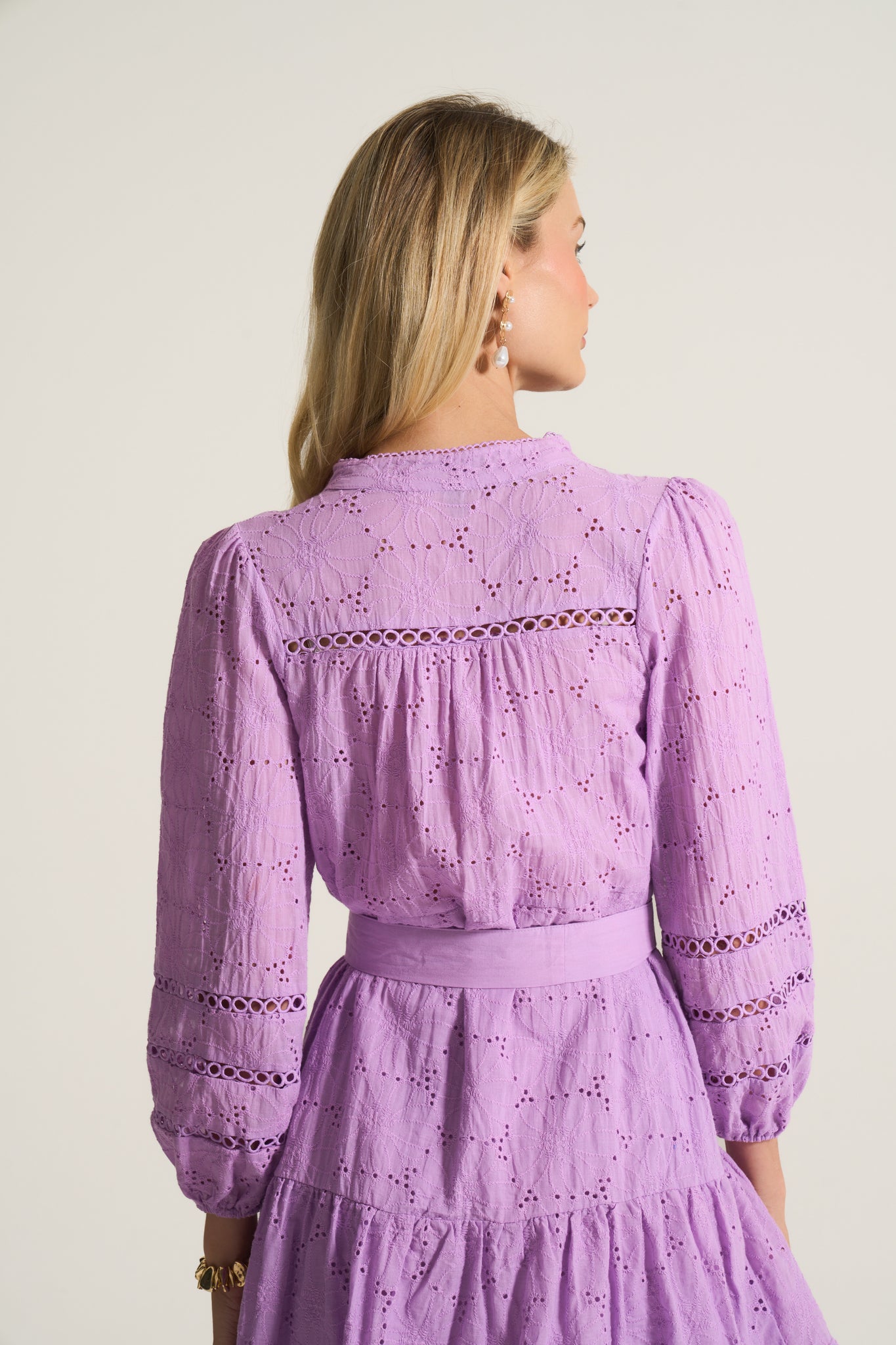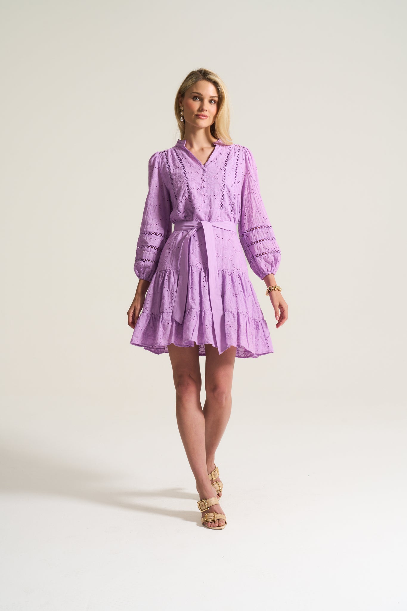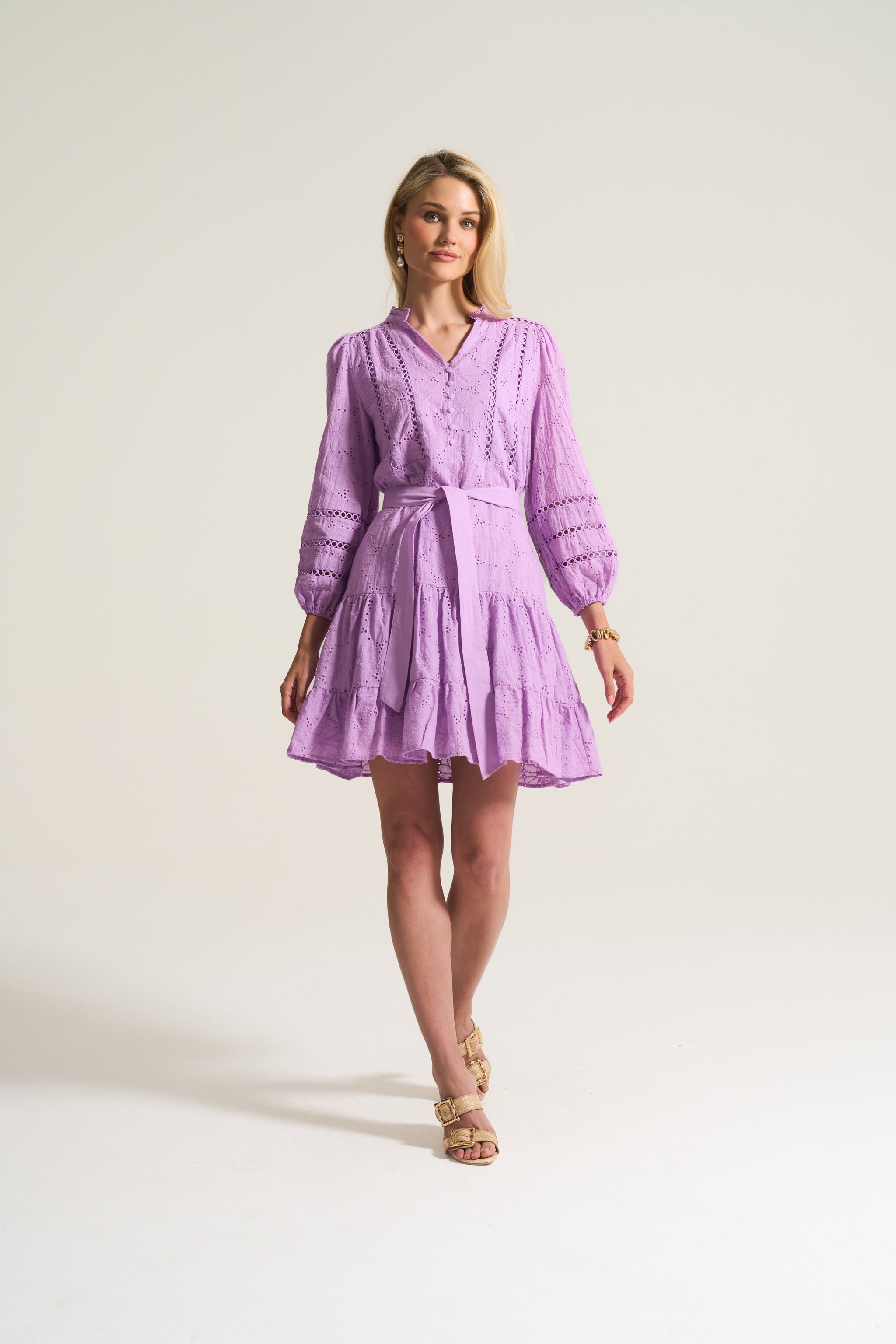 Fresh and feminine with a confident edge, the Lilac Tier Flirt Dress is crafted from 100% cotton anglaise for a breathable, lightweight feel. Designed with soft tiered detailing and finished with a self-fabric belt to define the waist, this mini dress balances playful movement with everyday polish. An easy statement piece that feels effortless yet considered.