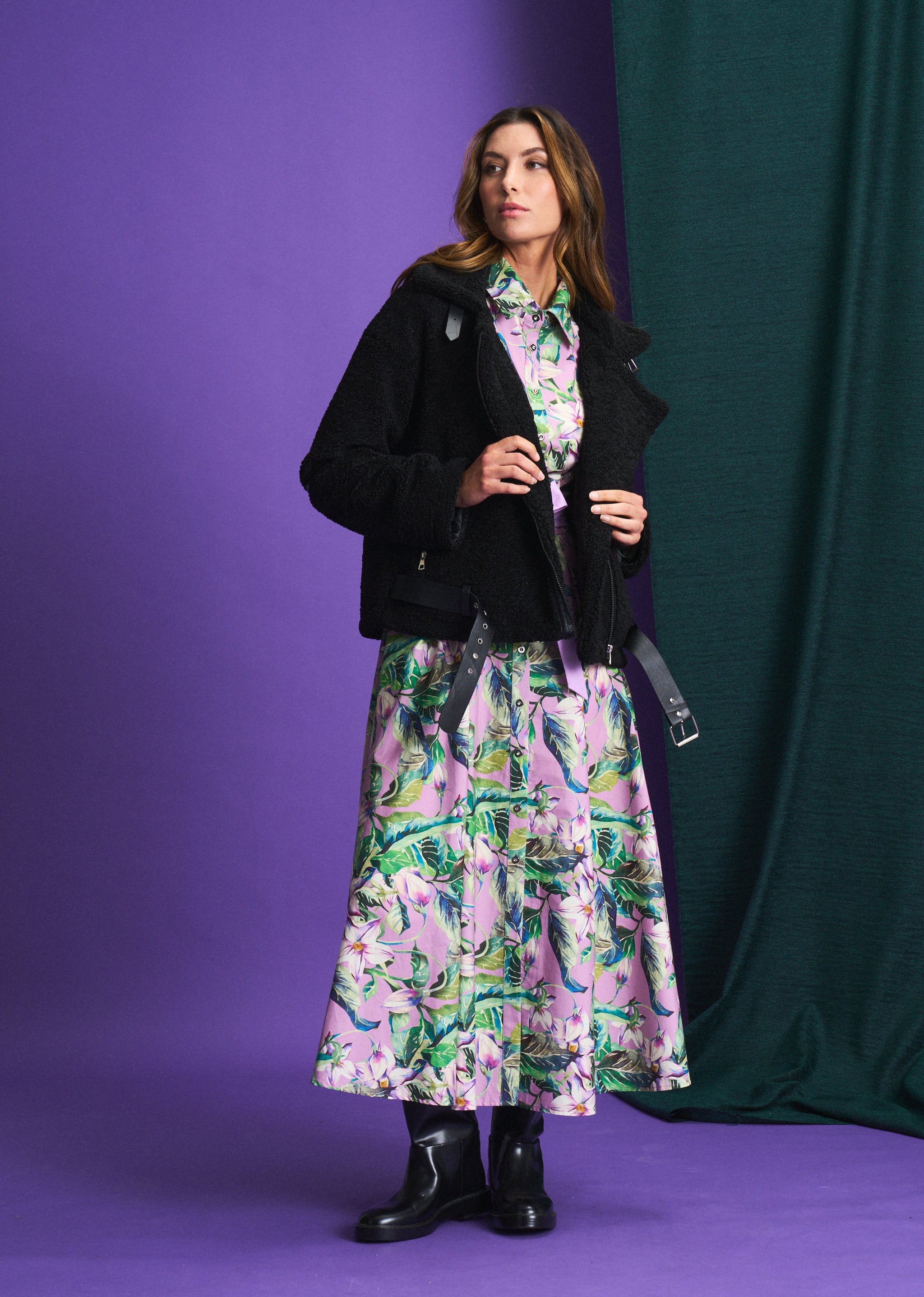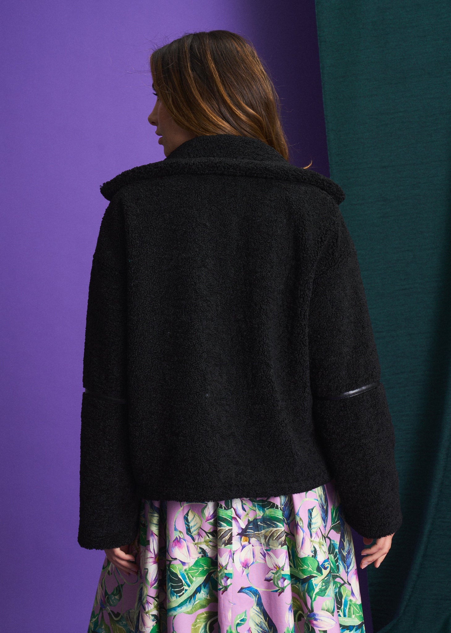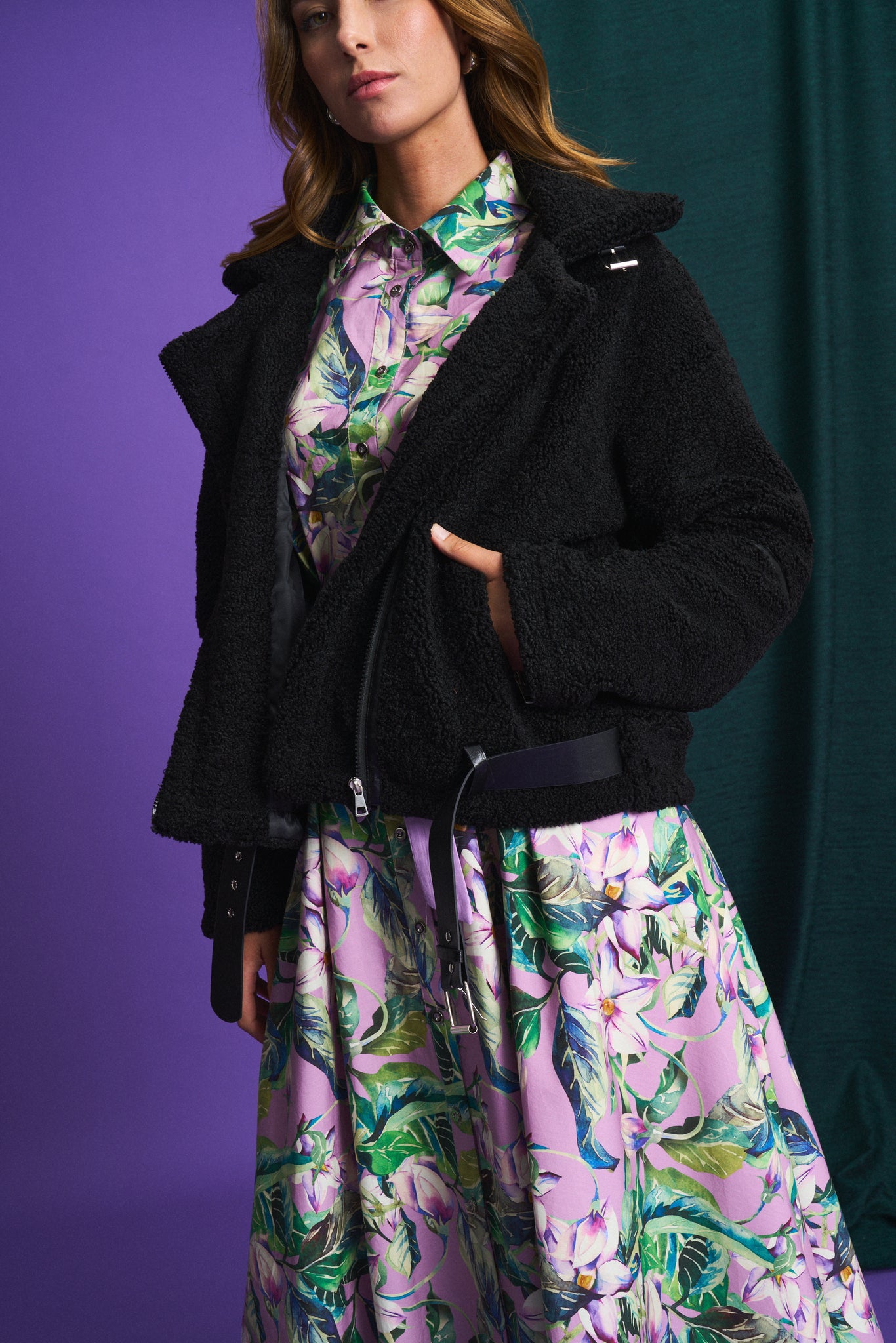The classic biker silhouette is reimagined with a plush, textured finish, offering both comfort and attitude. Designed to elevate any look, it pairs effortlessly with feminine pieces — especially the Penelope Dress in purple, creating a striking contrast between soft elegance and modern structure.